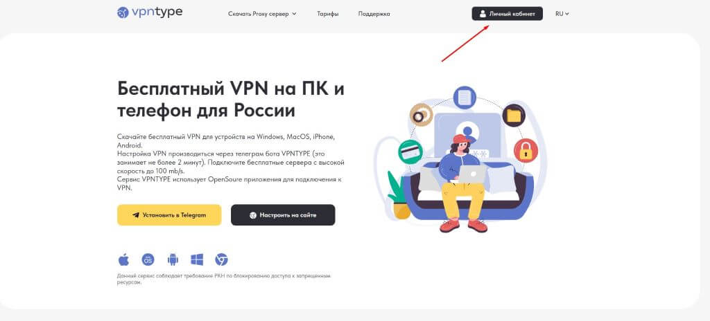 Для использования услуг VPNTYPE потребуется зарегистрировать учетную запись. Чтобы это сделать, нажмите на кнопку «Личный кабинет» на официальном портале сервиса (доступен только с включенным ВПН). Либо вы можете воспользоваться телеграм-ботом сервиса и получить подписку здесь: