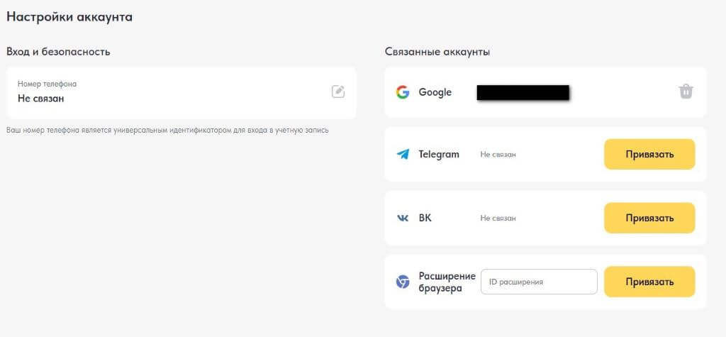В личном кабинете пользователя можно настроить привязку аккаунта к популярным социальным сетям и мессенджерам, а также к номеру мобильного телефона: